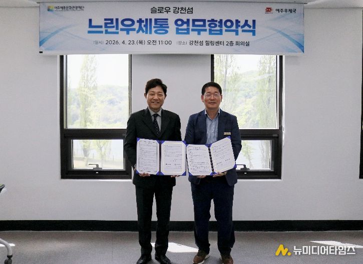 여주세종문화관광재단과 여주우체국은 4월 23일 강천섬 힐링센터에서 ‘슬로우 강천섬 느린우체통 업무협약(MOU)’을 체결했다. 빠르게 흘러가는 일상 속에서 잠시 걸음을 멈추고, 소중한 사람에게 미래의 마음을 전할 수 있는 감성 관광콘텐츠를 공동으로 운영하기 위해서다.