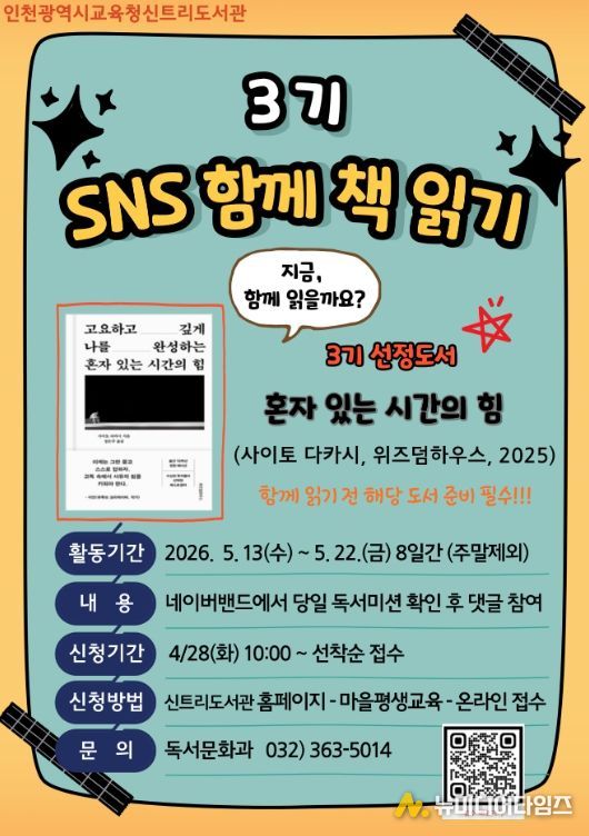 인천광역시교육청신트리도서관은 시민의 일상 속 독서 참여를 확대하고 온라인 기반 독서 문화를 활성화하기 위해, 4월 28일부터 ‘SNS 함께 책 읽기’ 3기 참여자를 모집한다.
