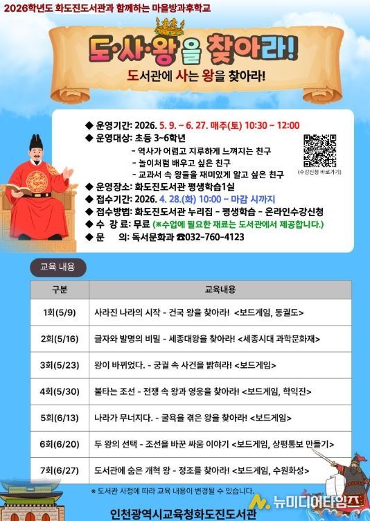 인천광역시교육청화도진도서관은 5월 9일부터 6월 27일까지 매주 토요일, 초등 3~6학년을 대상으로 역사 프로그램‘도서관에서 사는 왕을 찾아라!’를 운영한다.