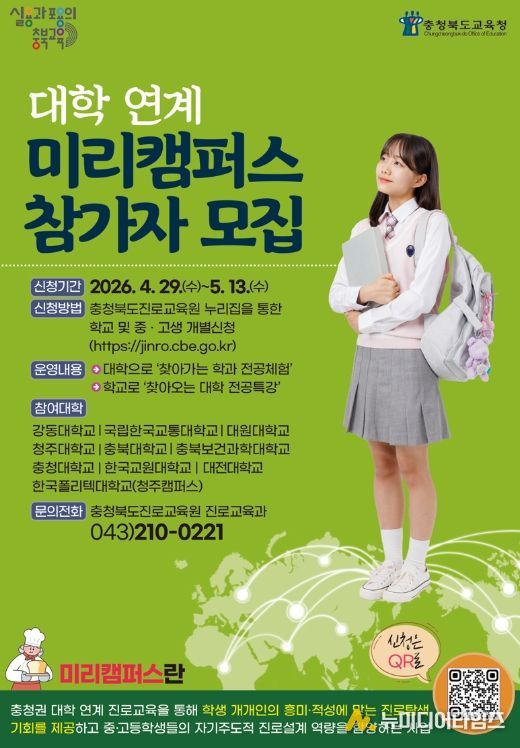 충청북도교육청 직속기관 진로교육원은 도내 중‧고등학생의 진로설계 역량 강화를 위해 '2026. 대학연계 미리캠퍼스 프로그램'을 확대 운영한다고 밝혔다.