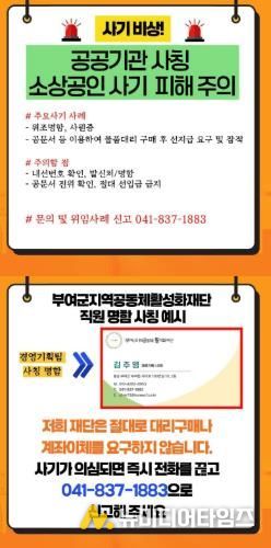 부여군 지역공동체활성화재단은 최근 재단 직원을 사칭하여 물품 구매를 요청하는 의심 사례가 확인됨에 따라, 지역 소상공인과 협력업체를 대상으로 피해 예방 안내에 나섰다고 밝혔다.
