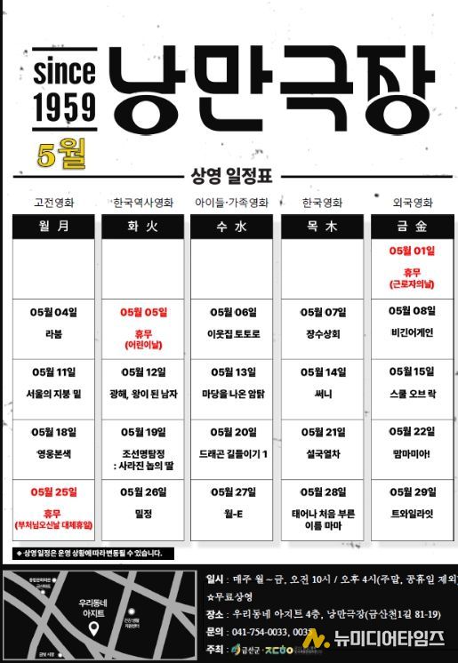 금산군은 도시재생사업으로 조성된 우리동네아지트 4층 낭만극장에서 진행하는 5월 무료영화 상영을 안내했다.