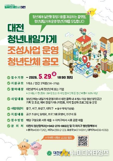 대전시는 청년이 지역에서 창업을 직접 경험하고 성장할 수 있는 ‘청년내일가게 조성사업’ 운영단체를 5월 29일까지 공개 모집한다.