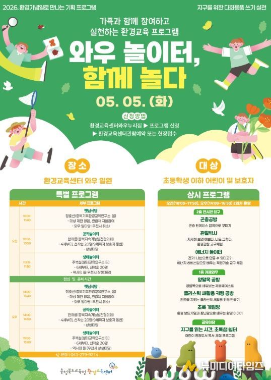 충청북도교육청 환경교육센터와우는 어린이날을 맞아 5월 5일 오전 10시부터 오후 4시 50분까지 센터 일원에서 '와우놀이터, 함께 놀다' 프로그램을 운영한다고 밝혔다.