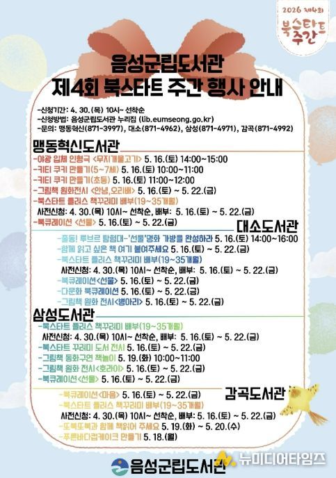 음성군립도서관(맹동혁신·대소·삼성·감곡)은 5월 16일부터 22일까지 ‘북스타트 주간’을 맞이해 영유아와 보호자가 함께 참여할 수 있는 다양한 프로그램을 운영한다.