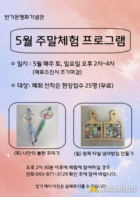 군 관계자는 “다가오는 주말, 반기문 평화기념관을 방문해 전시와 체험 프로그램을 함께 즐기고, 일상에서 사용할 수 있는 실용적인 작품도 만들어보는 뜻깊은 시간을 보내시길 바란다”고 말했다.