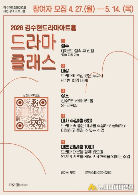청주시문화산업진흥재단이 운영하는 국내 유일의 드라마문학관 김수현드라마아트홀은 5월 14일까지 ‘드라마 클래스’참여자를 모집한다고 29일 밝혔다.