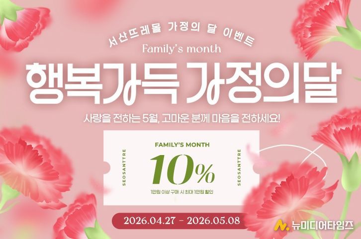 서산뜨레몰에서는 5월 8일까지 전 품목 구매 시 사용할 수 있는 10% 할인쿠폰(최대 1만 원 할인)을 제공한다.