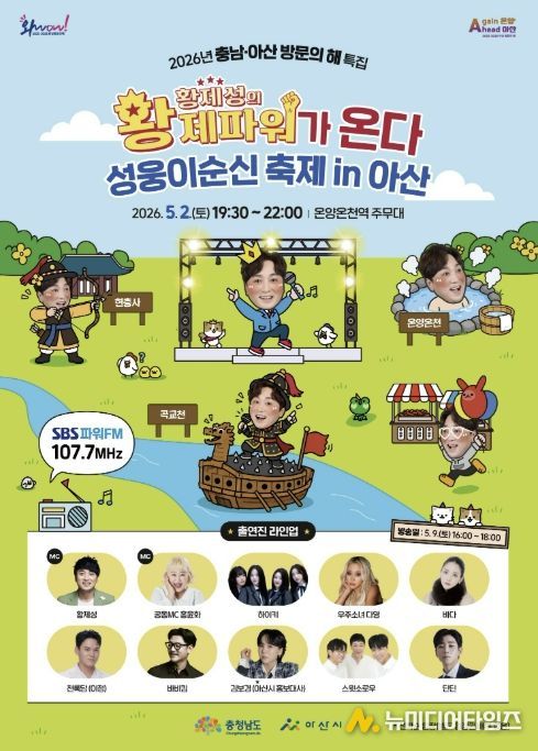 인기 라디오 프로그램 SBS 파워FM ‘황제성의 황제파워’ 공개방송이 5월 2일 ‘제65회 아산 성웅 이순신축제’ 현장에서 열린다. 아산에서 라디오 공개방송이 열리는 것은 2013년 ‘대한민국 아산 온천대축제’ 이후 13년 만이다.