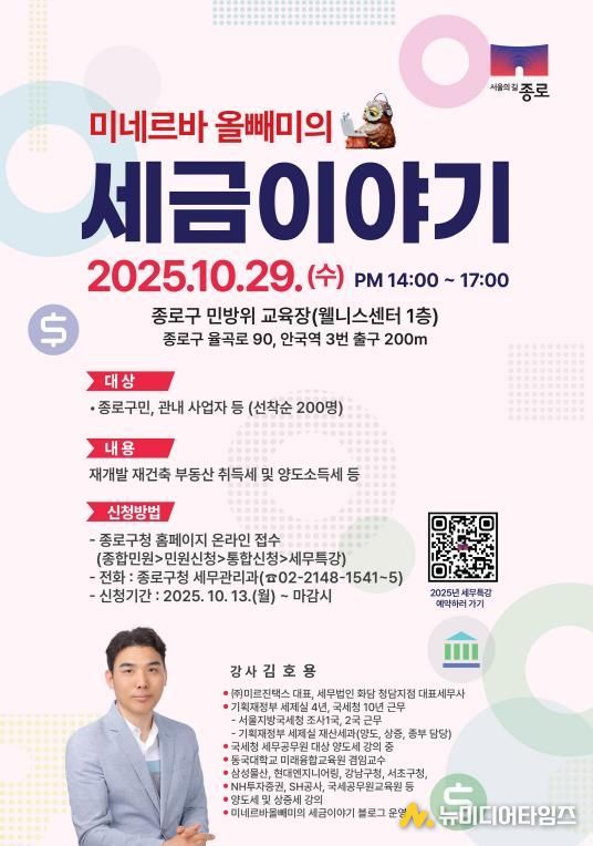 종로구가 오는 10월 29일, 오후 2시부터 5시까지 웰니스센터 1층 종로구 민방위교육장(율곡로 89)에서 '아는 만큼 덜 낸다' 구민 절세 특강을 개최한다.