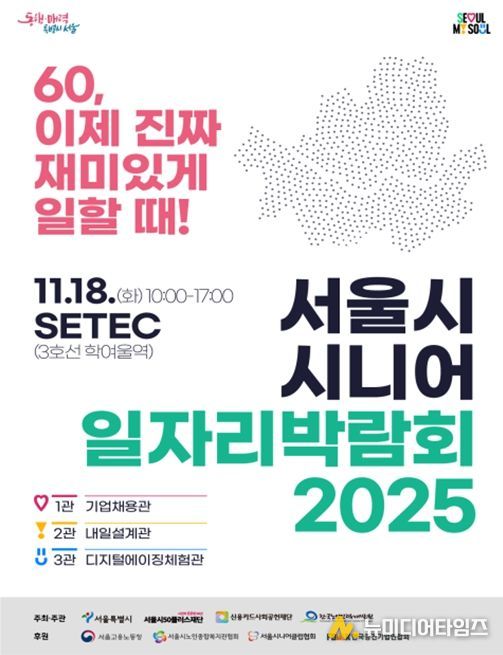서울시는 오는 11월 18일 SETEC(강남구)에서 '서울시 시니어 일자리박람회 2025'를 개최한다. 초고령사회 대응 종합대책 ‘9988 서울 프로젝트’의 하나로 마련된 이번 박람회에서는 시니어들이 쌓아온 경력과 전문성을 살려 경제적 자립을 이루고 사회참여를 확대할 수 있도록 다양한 프로그램이 진행된다.
