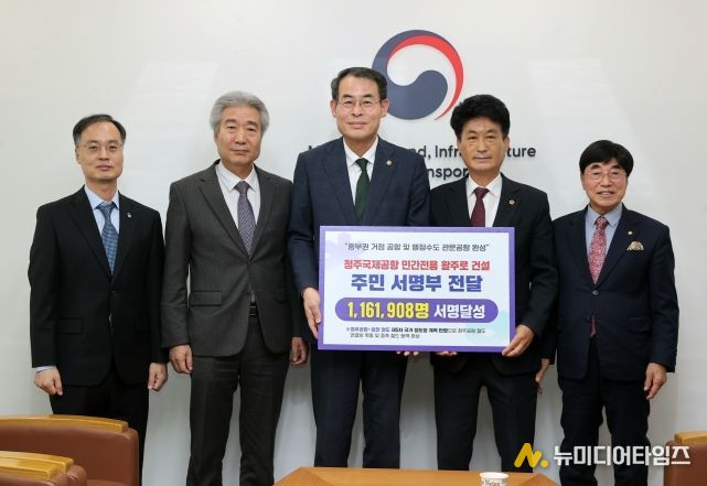 ‘청주공항 활성화 민‧관‧정 위원회’가 20일 강희업 국토교통부 제2차관을 방문하여 116만 명의 염원이 담긴 ‘청주공항 민간전용 활주로 건설’ 서명부를 전달했다.