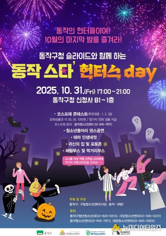 동작구가 오는 10월 31일 오후 5시부터 9시까지, 구청 신청사에서 청소년이 직접 기획하고 운영하는 제1회 핼러윈 축제'‘동작 스타’ 헌터스day'를 개최한다고 밝혔다.