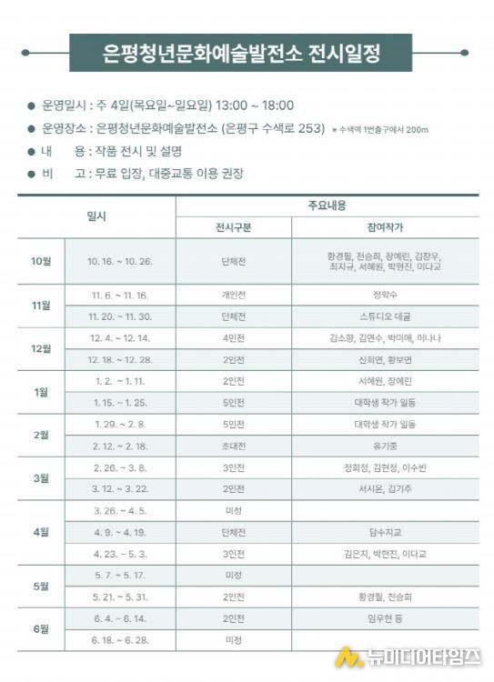전시는 은평청년문화예술발전소에서 매주 목요일부터 일요일, 오후 1시부터 6시까지 진행되며, 방문객들은 누구나 자유롭게 관람할 수 있다. 특히 매달 2~3회 전시회가 변경돼 새로운 작품들이 계속해서 선보일 예정이니, 은평구민들의 많은 관심과 방문을 바란다.