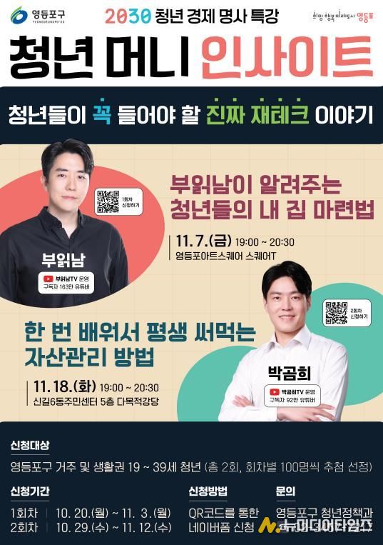 영등포구가 청년들의 실생활에 도움이 되는 자산 관리 비법을 제공하기 위해 경제 분야 특강 ‘청년 머니 인사이트’의 참여자를 모집한다고 밝혔다.