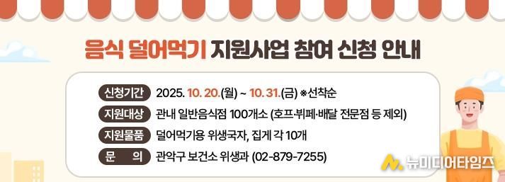 신청기간은 10월 31일까지이며, 선착순 마감한다. 신청방법은 관악구청 홈페이지에서 신청서를 내려받아 작성한 후, 관악구청 위생과 방문 또는 담당자 이메일로 제출하면 된다.