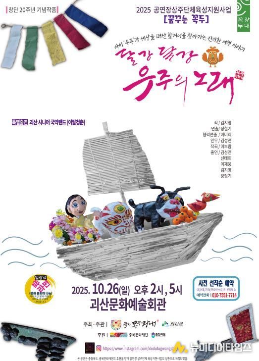 충북 괴산군은 괴산문화예술회관 상주단체인 ‘극단 꼭두광대’가 오는 26일 오후 2시와 5시, 괴산문화예술회관에서 창단 20주년 기념공연 ‘달강달강 우주의 노래’를 두 차례 선보인다고 23일 밝혔다.