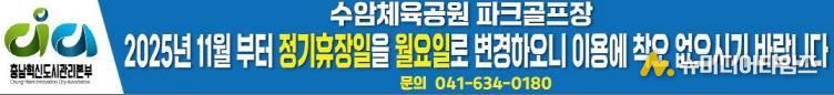 지방자치단체조합 충남혁신도시관리본부는 충남 예산군 삽교읍 목리에 조성된 수암공원 파크골프장의 정기 휴장일을 2025년 11월 부터 수요일에서 월요일로 변경하여 운영한다고 밝혔다.