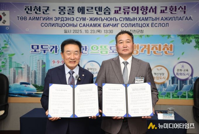 충북 진천군은 진천을 찾은 몽골 에르덴솜 대표단의 아유시 뭉궁바야르 군수와 우호 교류의향서를 교환했다고 23일 밝혔다.