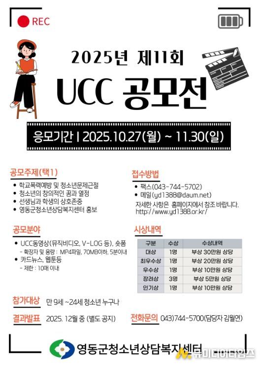 충북 영동군청소년상담복지센터는 27일부터 학교폭력 예방 및 건전한 청소년문화 확산을 위한 ‘2025년 제11회 UCC 공모전’을 개최한다.