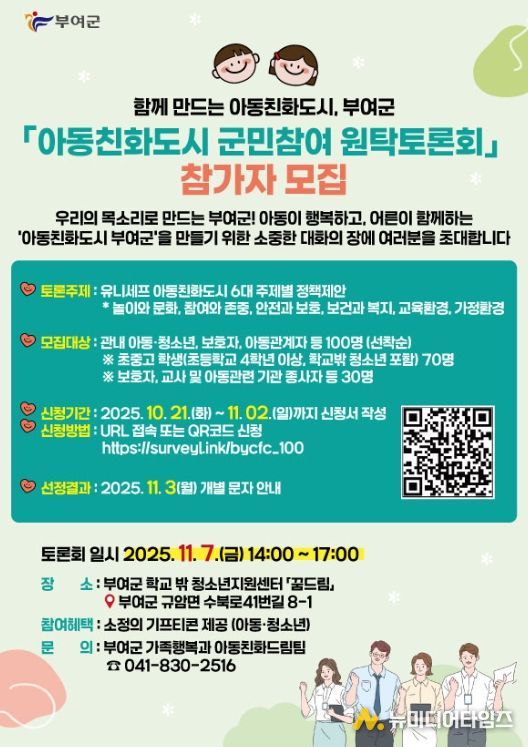 부여군은 아동·청소년, 보호자, 부여군민이 함께 참여하는 ‘아동친화도시 군민 원탁토론회’ 참가자를 오는 11월 2일까지 모집한다고 밝혔다.