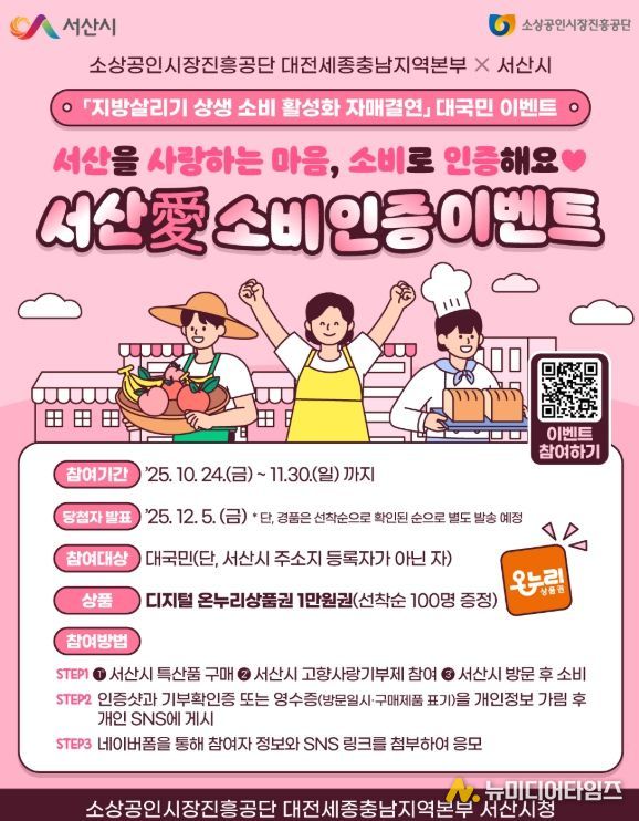 이벤트는 ▲서산시 특산품 구매 인증 ▲고향사랑기부제 기부 ▲서산시 관광지·축제·전통시장 방문 중 한 가지에 참여하면 선착순 100명에게 디지털 온누리상품권 1만 원을 제공한다.