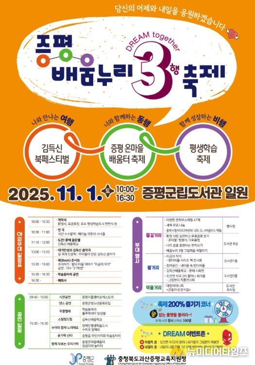 충북 증평군이 내달 1일 오전 10시부터 오후 5시까지 증평군립도서관 일원에서 ‘2025년 증평 배움누리 3행 축제: 당신의 어제와 내일을 응원합니다’를 개최한다.