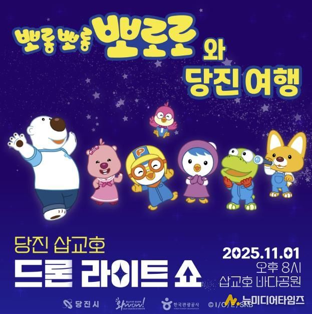 당진시는 오는 11월 1일 삽교호관광지 바다공원 일원에서 ‘뽀롱뽀롱 뽀로로와 당진 여행’을 주제로 2025 당진 삽교호 드론 라이트 쇼의 화려한 폐막 공연을 개최한다고 27일 밝혔다.