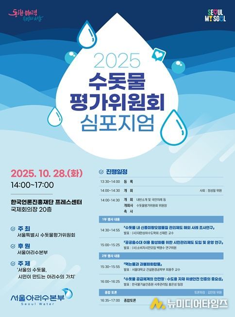 서울시 수돗물평가위원회는 10월 28일 ‘서울의 수돗물, 시민이 만드는 아리수의 가치’를 주제로 심포지엄을 개최한다.