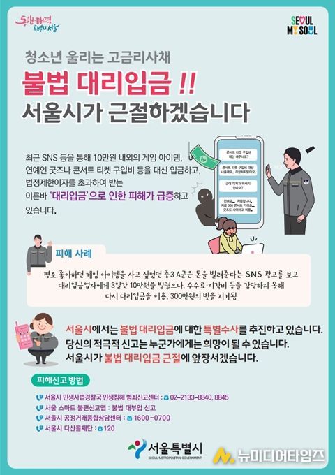 한편 불법 대리입금 관련 피해는 서울시 민생사법경찰국 민생침해 범죄신고센터, 서울시 공정거래종합상담센터, 서울시 다산콜재단을 통해 누구나 신고할 수 있다. 서울스마트불편신고 앱 ‘민생침해 범죄신고’에서도 신고할 수 있다.