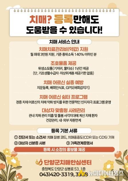 충북 단양군 치매안심센터는 치매환자와 가족의 삶의 질을 높이고 조기 지원 체계를 강화하기 위해 치매환자 등록을 적극 독려하고 있다.