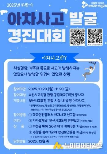 부산광역시교육청은 지난 20일부터 다음달 28일까지 관내 학교(기관) 근로자를 대상으로 ‘하반기 아차사고 발굴 경진대회’를 개최한다고 29일 밝혔다.