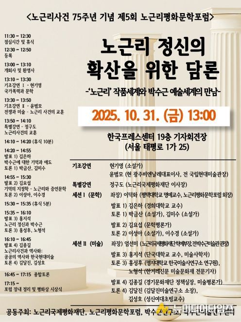 노근리국제평화재단은 오는 31일 오후 1시 서울 태평로 한국프레스센터 19층 기자회견장에서 '노근리사건 75주년 기념 제5회 노근리평화문학포럼'을 개최한다.