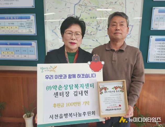 서천군 서천읍행복나눔후원회는 지난 28일 이웃돕기 성금 100만원을 기탁한 ㈜약손상담복지센터 김내현 센터장을 ‘좋은이웃사촌’ 183호로 선정했다.