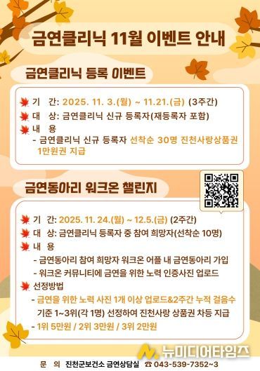 충북 진천군은 군민의 건강증진과 금연 실천 분위기 확산을 위해 11월 3일부터 12월 5일까지 금연 클리닉 내소자를 대상으로 ‘금연 클리닉 등록 이벤트’와 ‘금연 동아리 워크온 챌린지’를 운영한다.