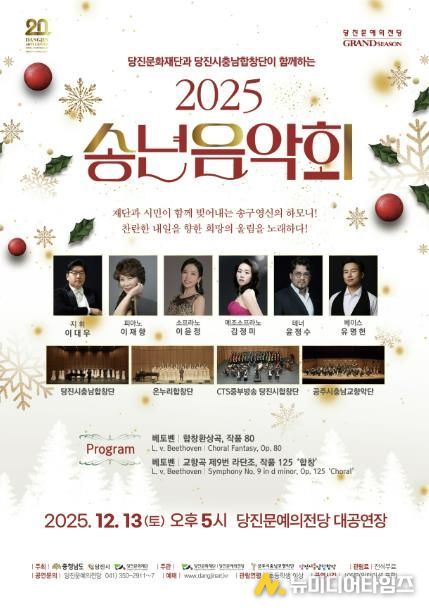 (재)당진문화재단·당진문예의전당은 오는 12월 13일 토요일 오후 5시, 당진문예의전당 대공연장에서 '2025 송년음악회'를 개최한다. 이번 공연은 충청남도와 당진시, 당진문화재단이 주최하고, 당진문화재단·당진문예의전당, 공주시충남교향악단, 당진시충남합창단이 공동주관한다.