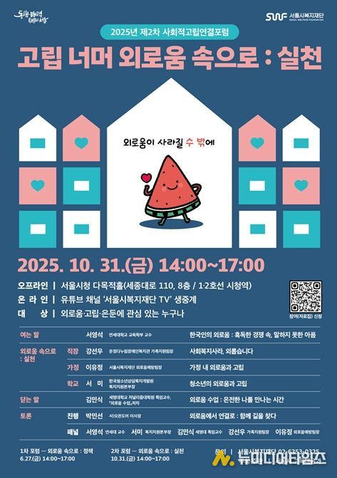 서울시복지재단 고립예방센터는 31일 오후 2시, 서울시청 8층 다목적홀에서 '2025년 제2차 사회적고립연결포럼'을 개최한다.