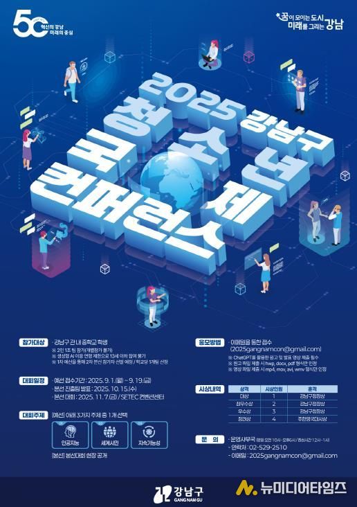 꿈이 모이는 도시, 미래를 그리는 강남구가 11월 7일 오전 10시부터 오후 5시까지 SETEC 콘퍼런스센터(남부순환로 3104)에서 ‘2025 강남구 청소년 국제 콘퍼런스’를 개최한다. 이번 대회는 관내 중학생들을 대상으로 ‘생성형 AI(ChatGPT)를 활용한 국제 이슈 영어 발표’라는 새로운 형식의 창의 융합형 교육 축제로 마련됐다.