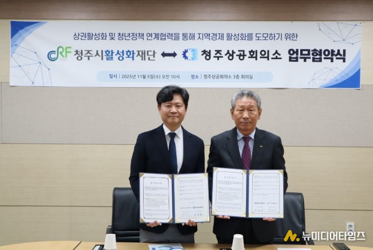 청주시활성화재단과 청주상공회의소는 5일 청주상공회의소 3층 회의실에서 지역경제 활성화와 청년 정착 기반 강화를 위한 업무협약을 체결했다.