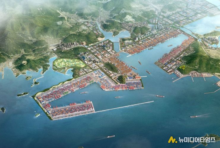 진해신항은 2040년까지 총 14조 6,600억 원을 투입해 8,000TEU급 초대형 컨테이너선 21선석을 갖춘 대규모 항만으로 조성된다.