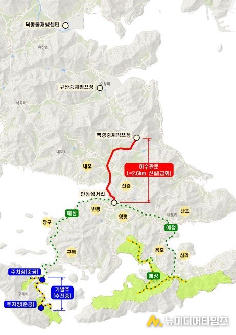 창원특례시는 금회 사업비 36억 원으로 구산면 심리 일원에 하수관로(L=2.6km) 설치하여 관광단지 및 인근 마을에서 발생하는 오수를 덕동물재생센터에서 처리하도록 하는 구산해양관광단지 공공기반시설(하수도) 설치사업을 추진할 계획이다.