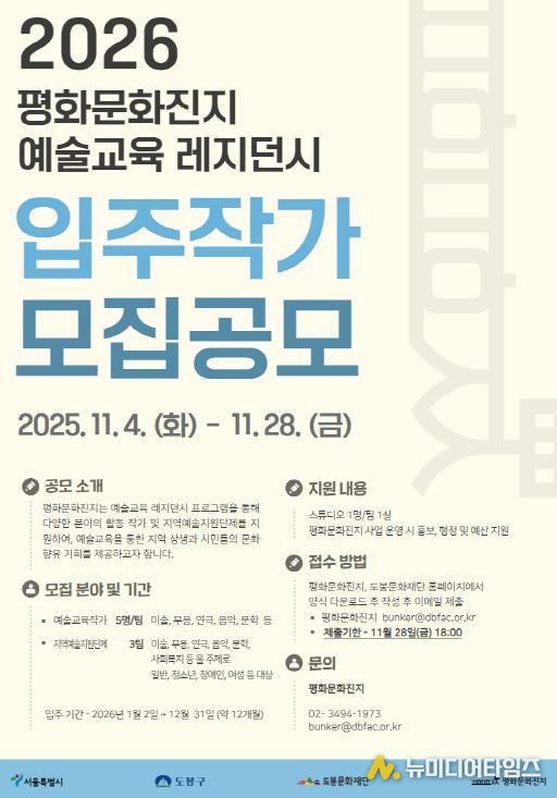 서울 도봉구 도봉문화재단 평화문화진지가 11월 28일까지 녪년 평화문화진지 예술교육 레지던시’입주작가를 모집한다.