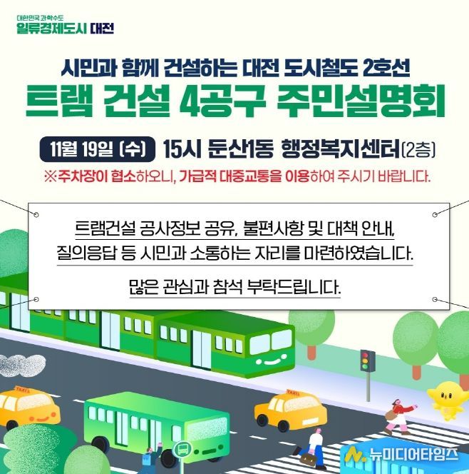 대전시는 19일 오후 3시 둔산1동행정복지센터에서 도시철도 2호선 4공구(수정타운아파트~대전둔산경찰서) 건설공사와 관련한 주민설명회를 개최했다.
