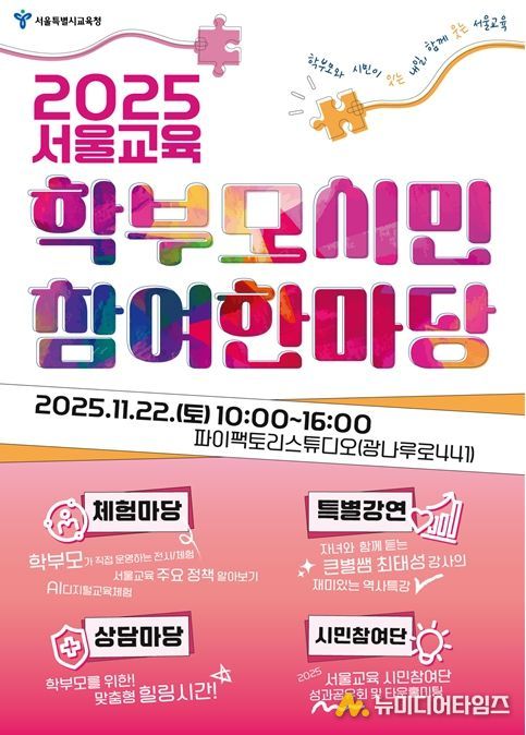 서울특별시교육청은 ‘학부모와 시민이 잇는 내일, 함께 웃는 서울교육’을 슬로건으로 '서울교육 학부모․시민 참여 한마당'을 11월 22일 오전 10시부터 오후 4시까지 광진구 파이팩토리 스튜디오(광진구 광나루로 441)에서 개최한다.