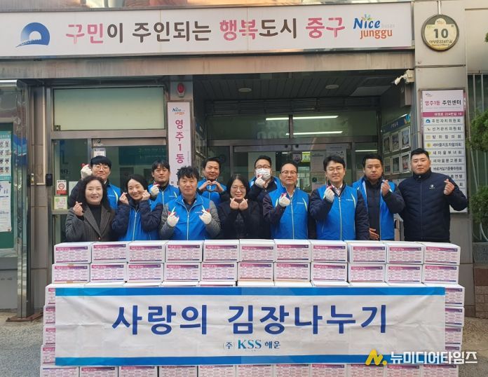 ㈜KSS해운(대표 박찬도) 임직원으로 구성된 나눔봉사단은 지난 19일 영주1동주민센터에 방문하여 저소득 주민에게 지원할 사랑의 김장김치(5kg) 150박스를 전달했다.