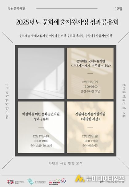 강원문화재단은 2025년도 주요 예술지원사업에 참여한 예술인·예술단체와 함께 올 한 해의 성과를 나누고 2026년 사업 방향을 모색하기 위한 세 개의 성과공유회를 12월 중 순차적으로 개최한다.