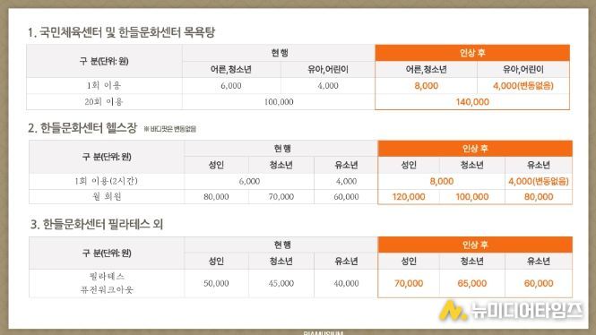 국민체육센터와 한들문화센터 내 목욕탕 1회 이용요금은 2,000원, 20회 이용요금은 4만 원 인상된다.