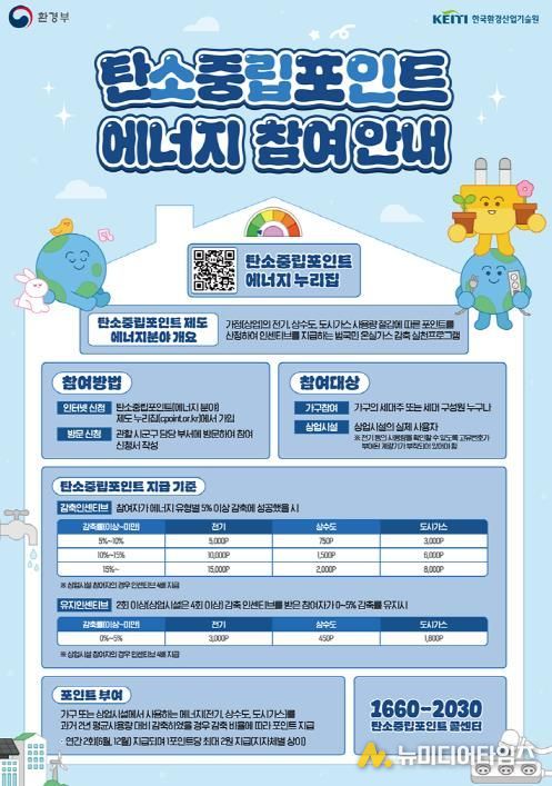 탄소중립포인트제는 가정에서 전기·수도·가스 사용량을 절감하거나 자동차 운행거리를 줄일 경우, 그 실적에 따라 포인트를 적립해 인센티브로 환급하는 제도다. 시민이 일상생활 속에서 손쉽게 참여할 수 있는 생활밀착형 탄소중립 정책으로 자리매김하고 있다.