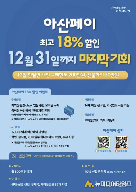 아산시는 시민 체감도를 높이기 위해 연말까지 아산페이 할인 혜택을 집중 운영하고 있다. 현재 개인 이용자는 10% 선할인과 사용금액의 8% 캐시백을 더한 최대 18% 혜택을 적용받고 있다. 이는 시민의 물가 부담을 낮추는 동시에, 소비가 지역 소상공인 매출로 곧바로 이어지도록 설계된 구조다.