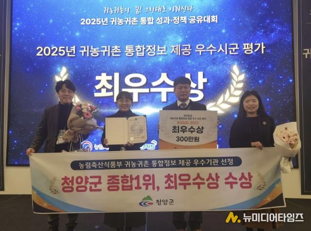 청양군은 농림축산식품부가 주관한 2025년 귀농귀촌 통합정보 제공 우수 시·군 평가에서 전국 1위를 차지하며 최우수상을 수상했다고 18일 밝혔다.